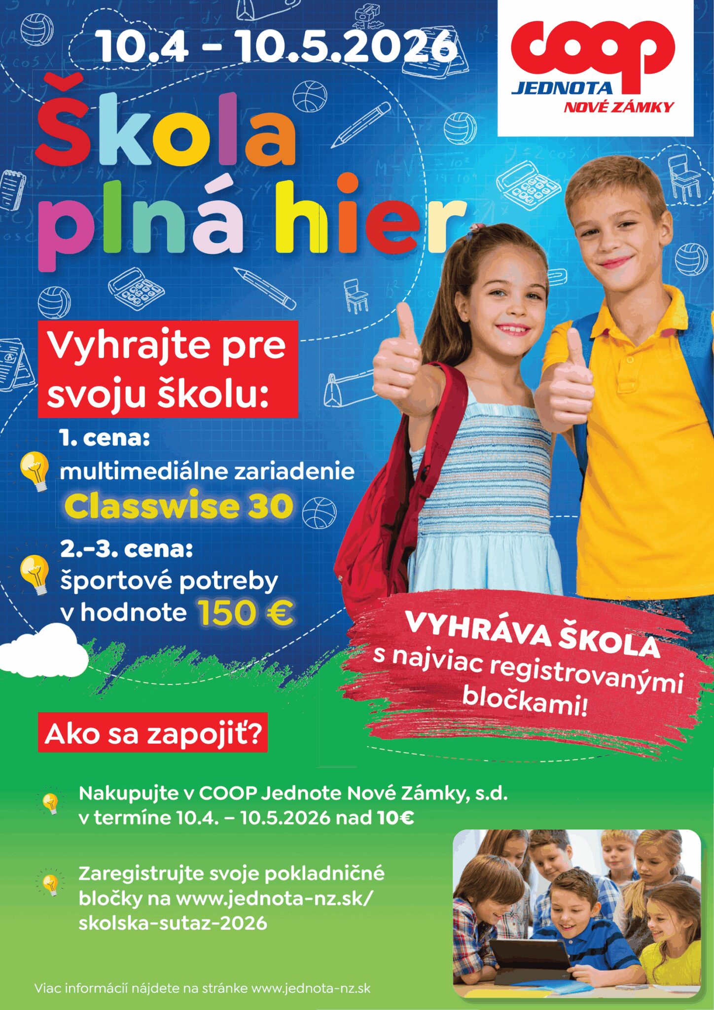 COOP Jednota Nové Zámky prináša aj tento rok obľúbenú súťaž Škola plná hier, ktorá už niekoľko rokov pomáha školám získať nové vybavenie a podporuje ich aktivity.